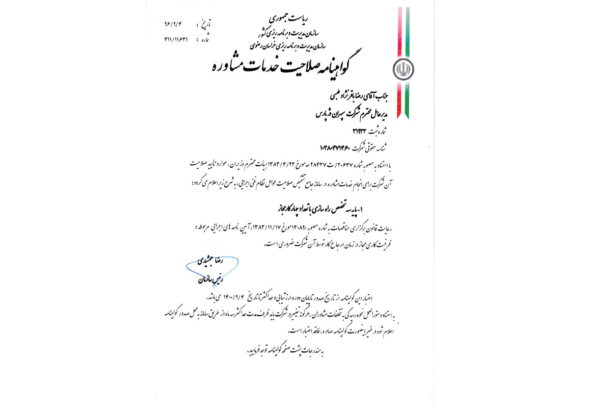 گواهینامه سازمان مدیریت و برنامه ریزی خراسان رضوی